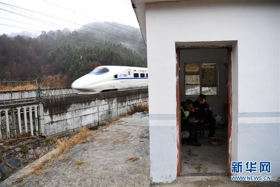 12月18日,常曉龍(右)和輔警在治安崗?fù)だ锝涣?。新華社記者劉軍喜攝