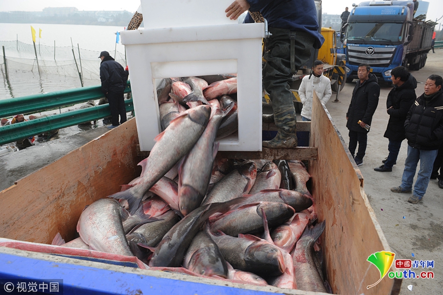 八里河冬捕與其他地方的捕魚方式不同,漁民們提前一個月的時(shí)間駕駛小船,自東向西驅(qū)逐魚群,漸漸地會把近兩萬畝水面的魚群都聚攏到碼頭附近一百多畝用圍網(wǎng)柵起來的區(qū)域。據(jù)當(dāng)?shù)貪O場負(fù)責(zé)人介紹“為了賣出好價(jià)格,今年與往年一樣,先根據(jù)市場行情確定底價(jià),然后通過招投標(biāo)方式確定銷售商。”今年,為了吸引更多的人們來八里河參與冬捕活動,八里河漁場在活動當(dāng)天會拿出3萬斤鮮魚供市民選購。
