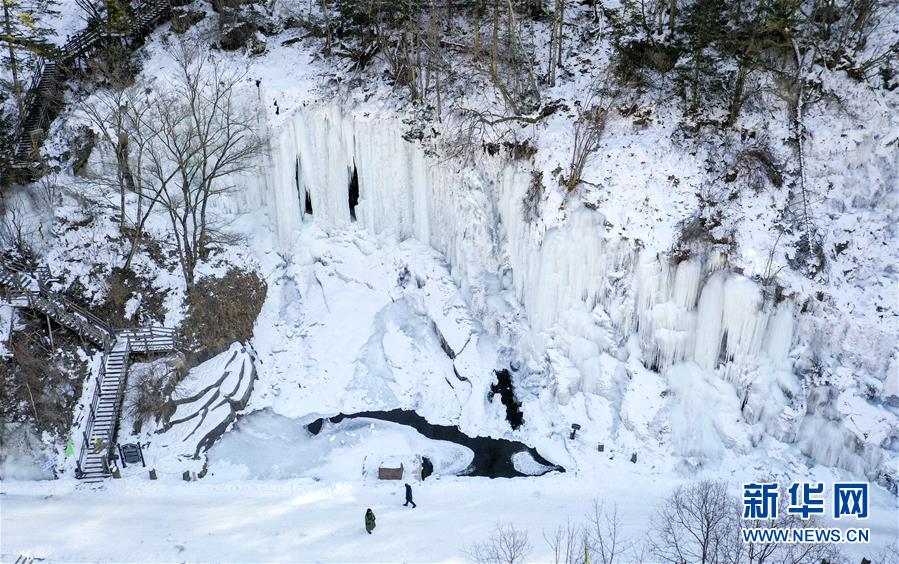 游人在吉林省長(zhǎng)白縣十五道溝望天鵝景區(qū)觀賞冰瀑景觀(1月3日無(wú)人機(jī)拍攝)。新華社記者許暢攝