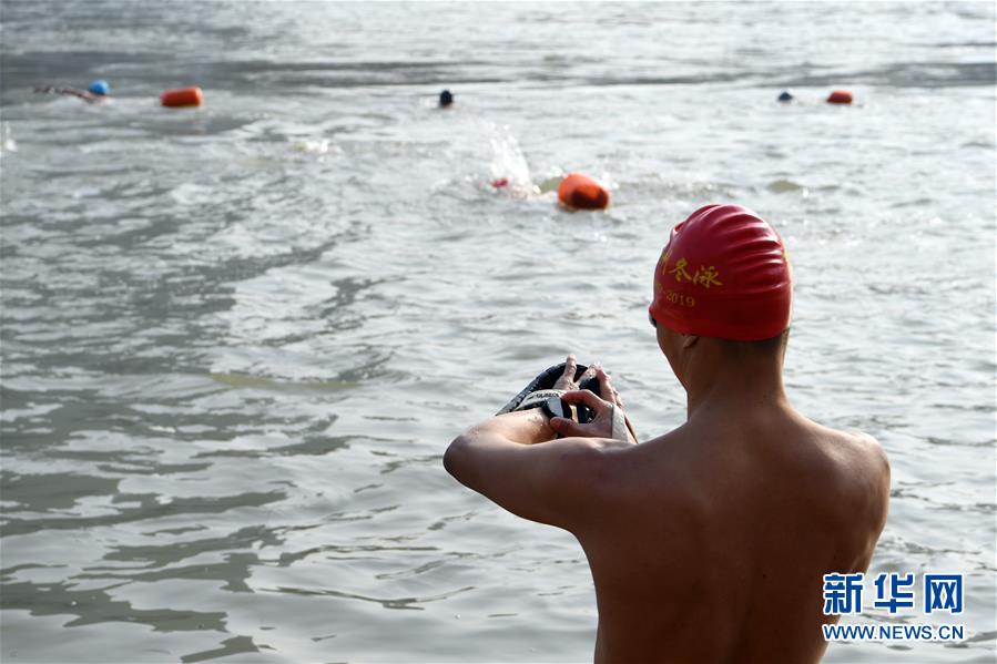12月20日,冬泳愛好者孟猛在冬泳前測量水溫,當日水溫僅為5攝氏度。新華社記者陶希夷攝