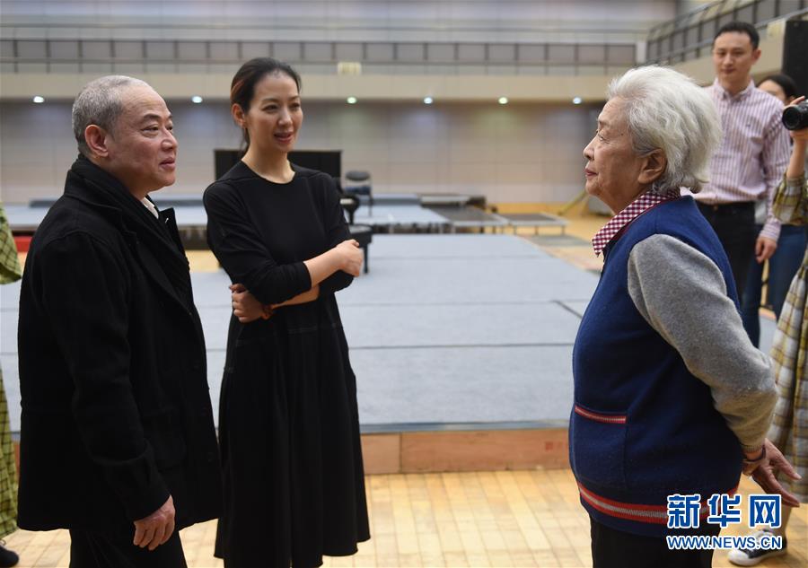 12月26日,電影《早春二月》中“陶嵐”的扮演者、老一代電影藝術(shù)家謝芳(右一)來到話劇《二月》探班現(xiàn)場,與李六乙導(dǎo)演(左一)和話劇《二月》中“陶嵐”的扮演者盧芳(左二)交流。  新華社記者 羅曉光 攝