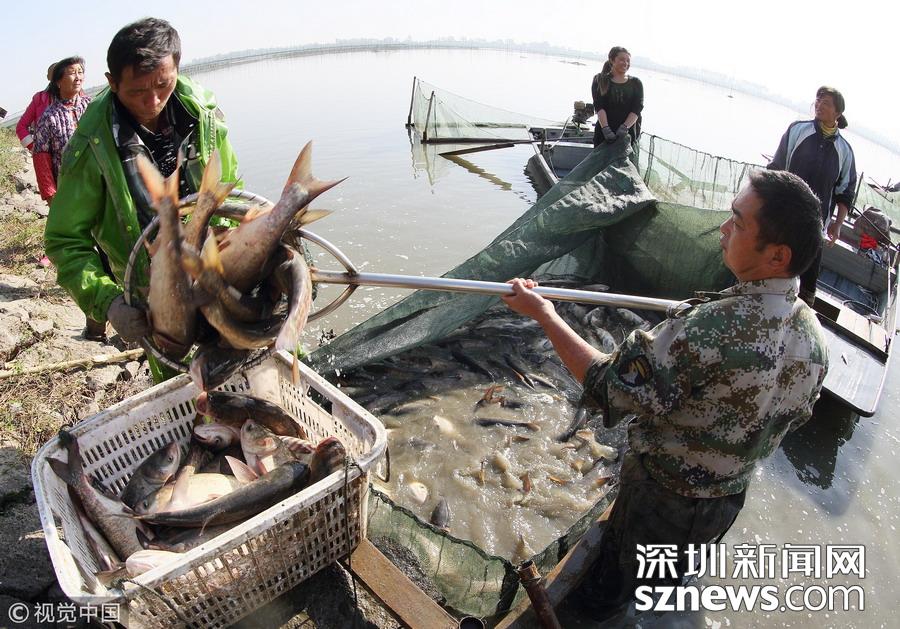 江蘇揚州,漁夫?qū)Ⅳ~撈出過秤。
