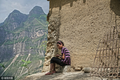 4月27日,阿土勒爾村的一個(gè)村民摔下了懸崖,村子里的大人對(duì)在山下讀書(shū)的孩子更加擔(dān)心起來(lái)。阿土勒爾村有15個(gè)6至15歲的孩子在山腳下的勒爾小學(xué)上學(xué),平時(shí)住校,每月月中和月底的周末才回家。每次上下山,家長(zhǎng)們都會(huì)輪流接送。圖片來(lái)源:視覺(jué)中國(guó)