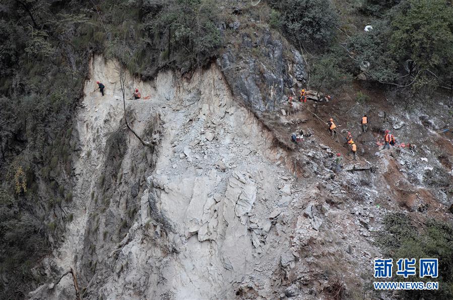 四川路橋施工隊(duì)伍在陡崖上作業(yè)(2019年11月20日攝)。阿布洛哈村通村公路施工遇到陡崖夾溝地勢(shì),項(xiàng)目進(jìn)程艱難緩慢,四川路橋施工隊(duì)伍開(kāi)始在峽谷兩端分頭推進(jìn)。新華社記者江宏景攝