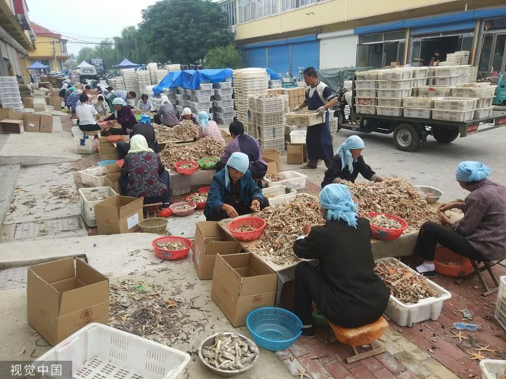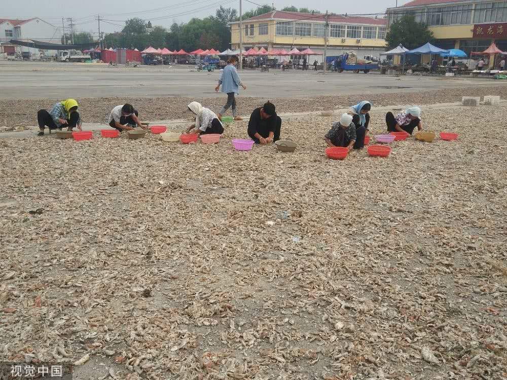 渤海灣畔海產(chǎn)豐收,成群魚(yú)蝦分揀后當(dāng)街晾曬,場(chǎng)面賽曬糧食