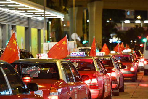 2019年8月23日,從香港港島筲箕灣出發(fā)的張掛中國國旗的出租車行駛在街道上。新華社記者劉大偉攝