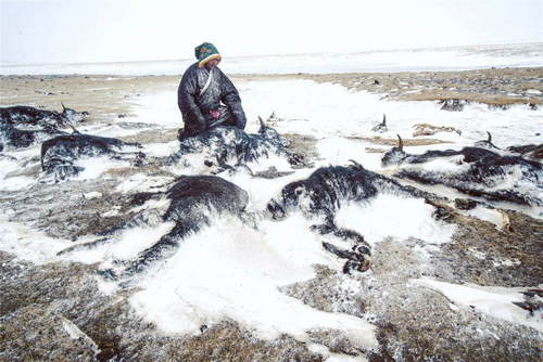 2019年2月23日,青海省玉樹藏族自治州稱多縣扎朵鎮(zhèn)治多村牧民坐在自家被凍死的牦牛前。2018年12月下旬以來,玉樹州境內(nèi)多次大范圍降雪,部分地區(qū)遭受重度、特重度雪災(zāi)。 新華社記者吳剛攝