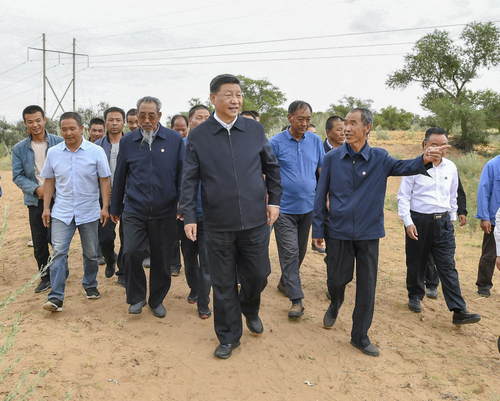 2019年8月19日至22日,中共中央總書記、國家主席、中央軍委主席習(xí)近平在甘肅考察。這是21日上午,習(xí)近平在武威市古浪縣八步沙林場察看林場整體風(fēng)貌,聽取武威市防沙治沙整體情況匯報和八步沙林場“六老漢”三代人治沙造林的感人事跡。新華社記者謝環(huán)馳攝