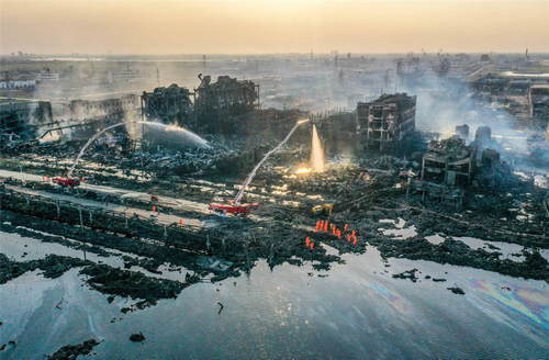 2019年3月23日拍攝的江蘇省鹽城市響水縣天嘉宜化工有限公司“3·21”特別重大爆炸事故現(xiàn)場(無人機照片)。新華社記者李博攝