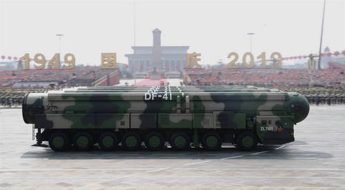 2019年10月1日,慶祝中華人民共和國成立70周年大會在北京天安門廣場隆重舉行。這是東風(fēng)-41核導(dǎo)彈方隊接受檢閱。新華社記者劉彬攝