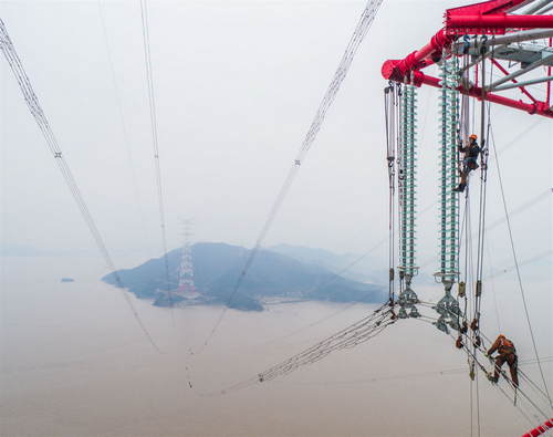 2019年1月3日,施工人員在浙江省舟山500千伏聯(lián)網(wǎng)輸變電工程380米跨海輸電鐵塔上進行驗收和消缺作業(yè)(無人機照片)。新華社記者徐昱攝