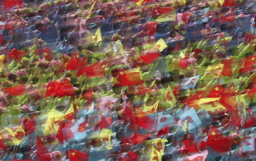 2019年10月1日,慶祝中華人民共和國成立70周年大會在北京天安門廣場隆重舉行。這是行進中的群眾游行方陣。新華社記者蘭紅光攝