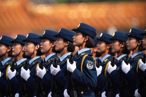 2019年10月1日,慶祝中華人民共和國成立70周年大會在北京天安門廣場隆重舉行。這是女兵方隊接受檢閱。新華社記者王毓國攝