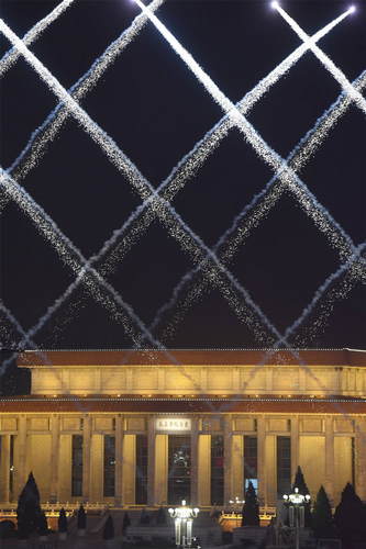 2019年10月1日,慶祝中華人民共和國成立70周年大會在北京天安門廣場隆重舉行。這是空中梯隊飛過天安門上空。新華社記者金良快攝