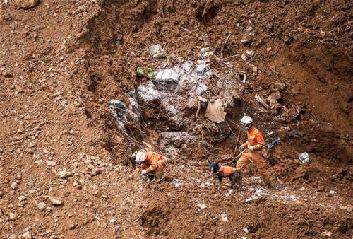 2019年7月26日,救援人員在貴州省水城縣“7·23”特大山體滑坡災(zāi)害現(xiàn)場進行搜救。新華社記者陶亮攝