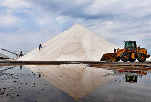 2019年7月3日,河北唐山海港經(jīng)濟開發(fā)區(qū)大清河鹽場的工人在洗鹽場工作。新華社記者楊世堯攝