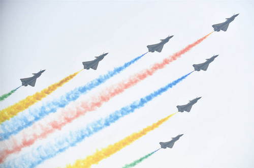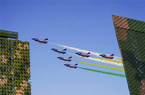 2019年10月21日,在吉林長春舉行的慶祝人民空軍成立70周年航空開放活動上,空軍八一飛行表演隊殲-10飛機編隊從靜態(tài)展示的新型雷達上空飛過。新華社發(fā)(萬全攝)