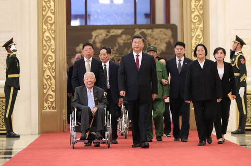 2019年9月29日,中華人民共和國國家勛章和國家榮譽稱號頒授儀式在北京人民大會堂金色大廳隆重舉行。中共中央總書記、國家主席、中央軍委主席習(xí)近平同國家勛章和國家榮譽稱號獲得者一同步入會場。新華社記者丁海濤攝
