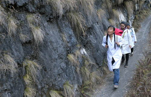 2019年1月13日,在云南省貢山縣丙中洛鎮(zhèn),管延萍(左)與同事走在進村的山路上。管延萍從經(jīng)濟發(fā)達的珠三角地區(qū),自愿到深度貧困地區(qū)云南怒江傈僳族自治州參加?xùn)|西部扶貧協(xié)作,并主動申請將期限從半年延長至3年。 新華社記者張加揚攝