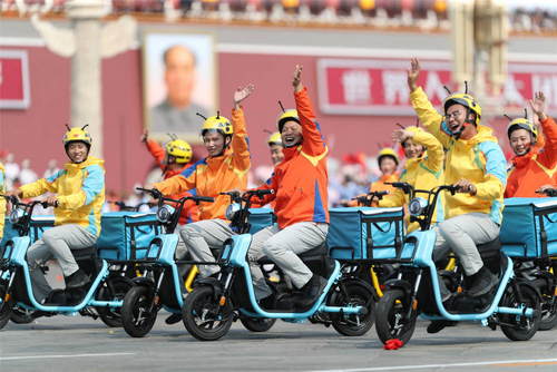 2019年10月1日,慶祝中華人民共和國成立70周年大會在北京天安門廣場隆重舉行。這是群眾游行中的美好生活方陣。新華社記者歐東衢攝