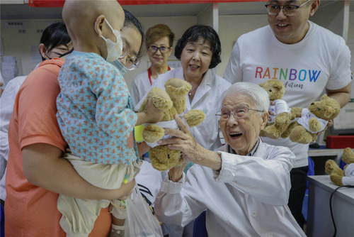 2019年5月31日,北京兒童醫(yī)院百歲兒科醫(yī)生張金哲(前右)在北京關(guān)愛惡性實體腫瘤患兒公益活動上向住院的孩子贈送兒童節(jié)禮物。新華社記者張玉薇攝