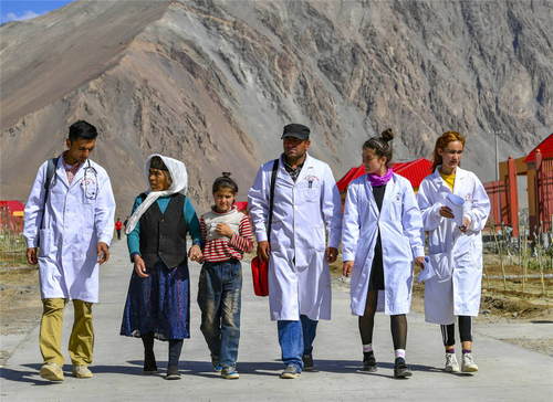 2019年7月7日,新疆塔什庫爾干塔吉克自治縣達布達爾鄉(xiāng)熱斯喀木村村醫(yī)發(fā)爾亞特·塔西白克(右三)與來自鄉(xiāng)衛(wèi)生院的醫(yī)務(wù)人員來到熱斯喀木村易地扶貧搬遷安置點出診。從過去騎著馬深入大山牧場巡診,到現(xiàn)在定期前往集中居住點上門服務(wù);從過去幾種簡單的常備藥,到如今種類豐富的各類藥品……新疆牧區(qū)的醫(yī)療條件和水平大幅提升,牧民享受到越來越多、越來越便利的醫(yī)療惠民服務(wù)。新華社記者胡虎虎攝