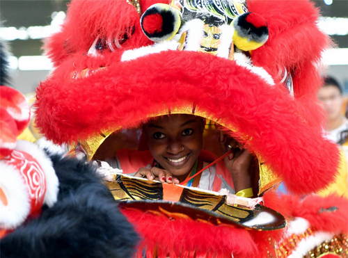 2019年10月28日,來自印度洋島國科摩羅的拉一莎在河南省鄭州西亞斯學(xué)院體驗舞獅。新華社記者李嘉南攝