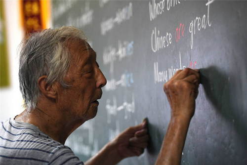 2019年7月30日,葉連平在“留守未成年人之家”教室里為第二天的英語課準備板書。暑期伊始,在安徽省和縣烏江鎮(zhèn)卜陳村“留守未成年人之家”,92歲的退休教師葉連平又開始了暑假的忙碌。新華社發(fā)(黃博涵 攝)