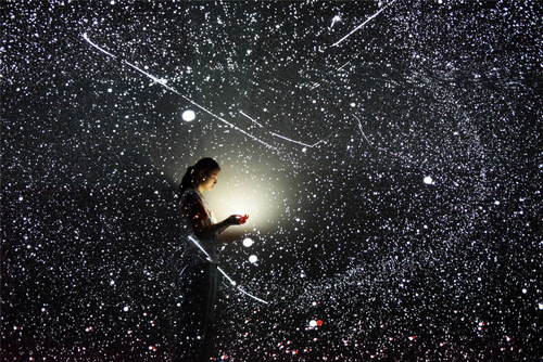 2019年5月28日, 參觀者在貴州省貴陽市舉辦的2019中國國際大數(shù)據(jù)產(chǎn)業(yè)博覽會“追夢·未來”數(shù)字藝術(shù)特展上觀看和體驗藝術(shù)作品《宇宙深空》。新華社記者楊文斌攝