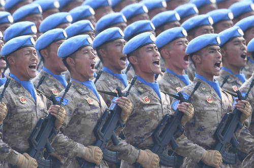 2019年10月1日,慶祝中華人民共和國成立70周年大會在北京天安門廣場隆重舉行。這是維和部隊方隊接受檢閱。新華社記者劉大偉攝