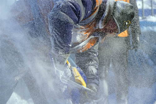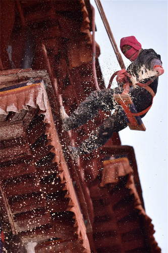 2019年1月23日,在黑龍江省漠河市嫩林線674公里處,加格達奇工務(wù)段橋隧工杜志彪在進行涵洞除冰作業(yè)。新華社記者才揚攝