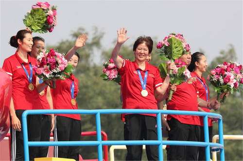 2019年10月1日,慶祝中華人民共和國成立70周年大會在北京天安門廣場隆重舉行。這是中國女排亮相“祖國萬歲”彩車。新華社記者歐東衢攝
