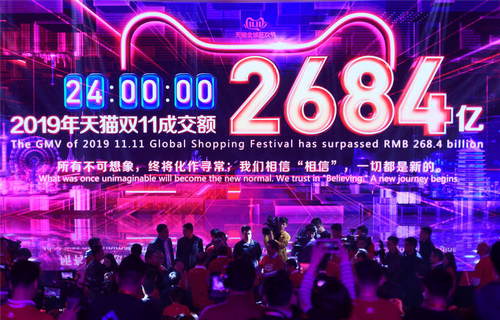 2019年11月12日,在浙江省杭州市阿里巴巴西溪園區(qū)媒體中心,大屏幕顯示阿里巴巴旗下天貓“雙十一”成交額超過2684億元。新華社記者黃宗治攝