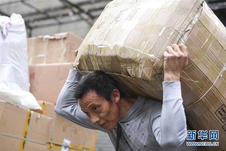 冉光輝在重慶朝天門大正商場內(nèi)搬運(yùn)貨物(1月5日攝)。新華社記者王全超攝