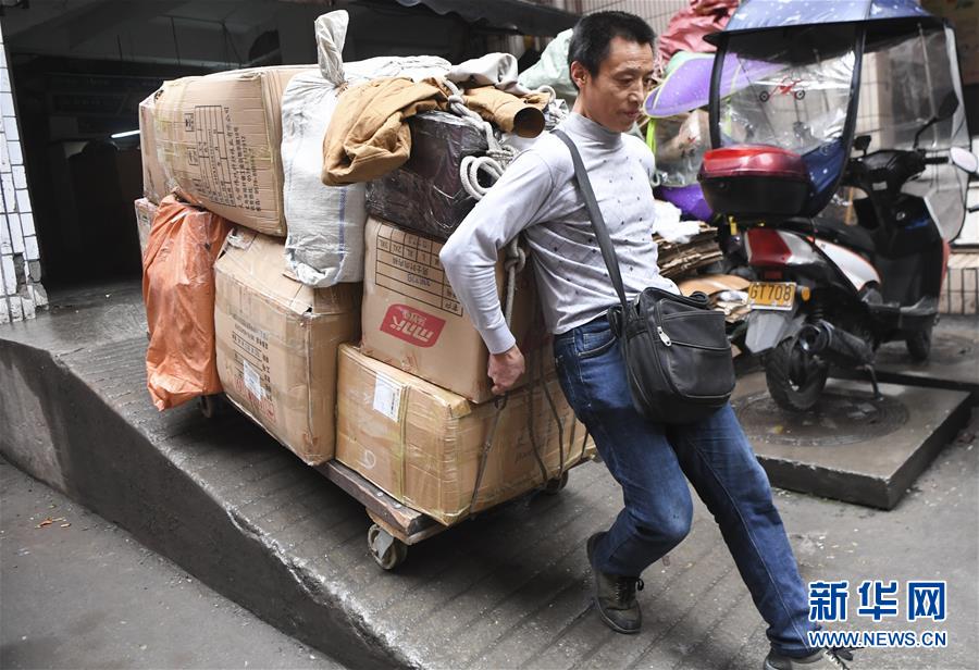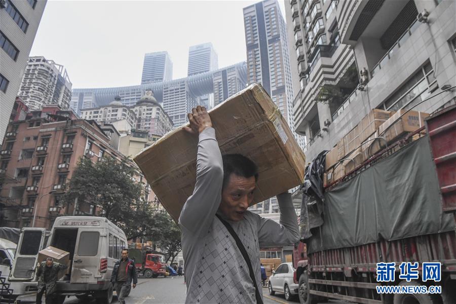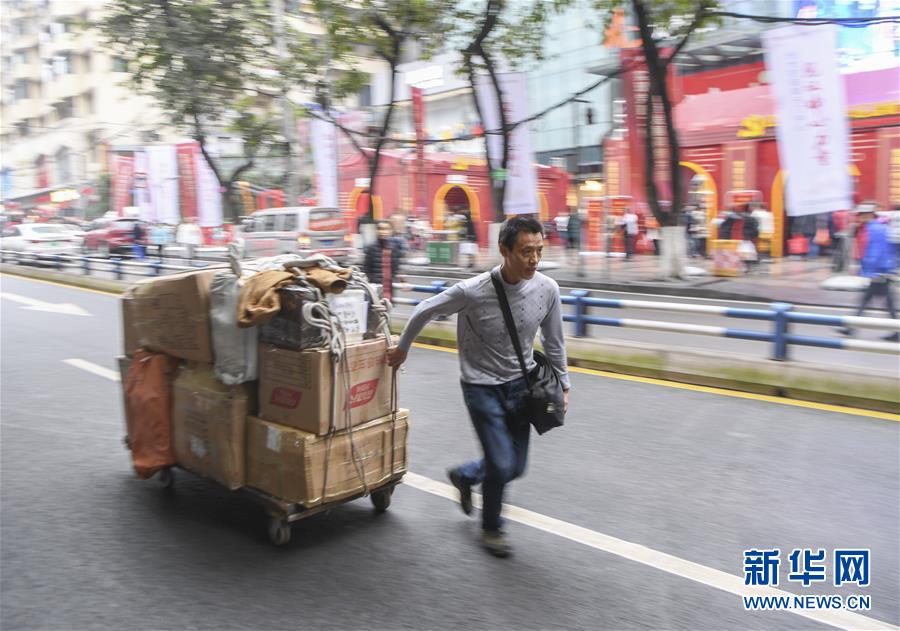冉光輝用小板車載著貨物,從重慶朝天門大生商場出發(fā),前往發(fā)貨地點(diǎn)(1月5日攝)。新華社記者王全超攝