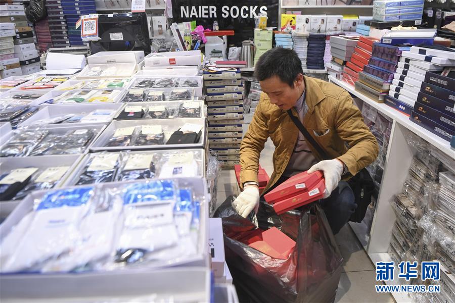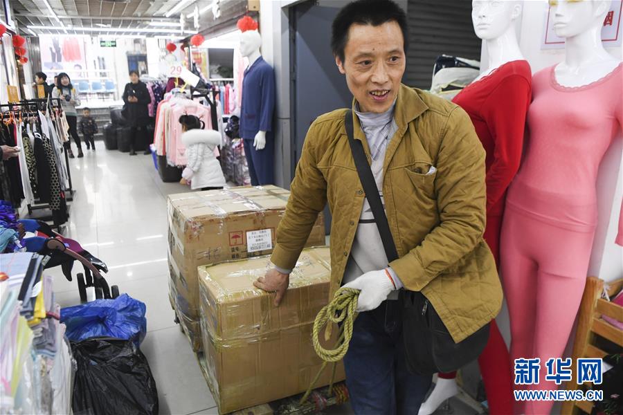 冉光輝在重慶朝天門大正商場內(nèi)整理即將搬運(yùn)的貨物(1月5日攝)。新華社記者王全超攝