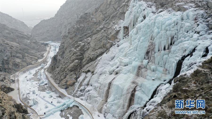 這是1月7日拍攝的賀蘭山巖畫景區(qū)內的冰瀑景觀(無人機照片)。近日,寧夏賀蘭山巖畫景區(qū)內,自然山泉凍結冰瀑和人造冰瀑景觀相結合,形成多處冰瀑景觀,山間形態(tài)各異的冰掛、冰柱鬼斧神工,蔚為壯觀,吸引眾多游客前來觀賞。 新華社記者 王鵬 攝