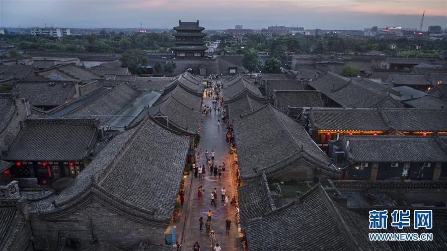 這是7月19日無人機拍攝的夕陽下的平遙古城。