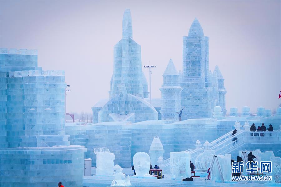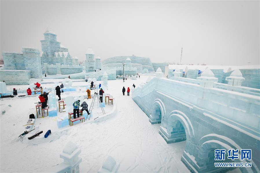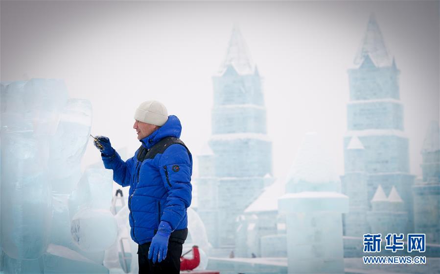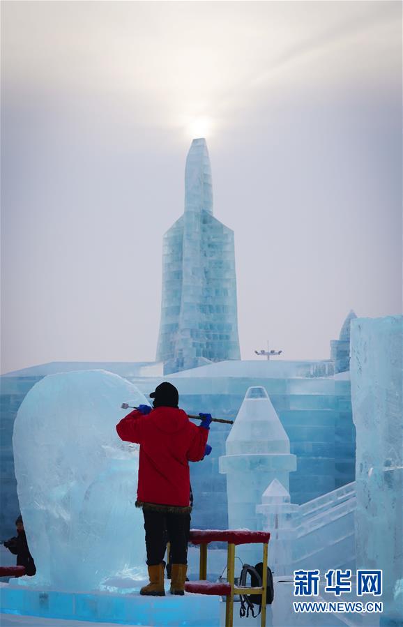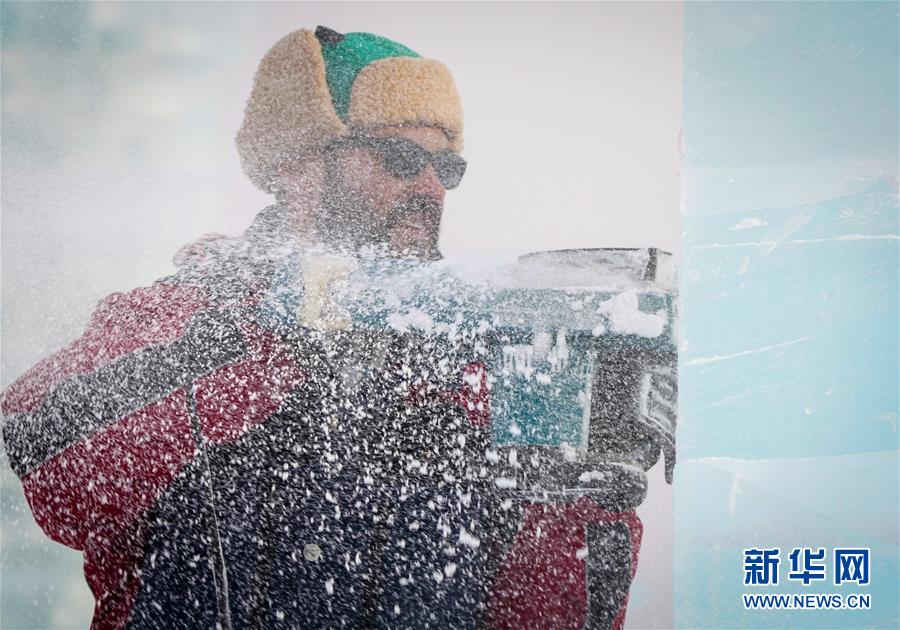 第九屆中國·哈爾濱國際組合冰雕比賽選手在哈爾濱冰雪大世界內(nèi)制作冰雕(1月2日攝)。新華社記者王松攝