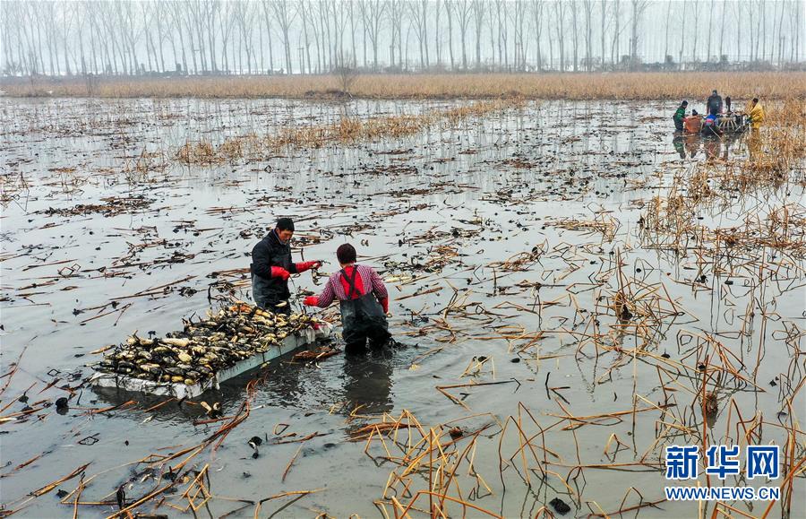 1月10日,村民在磁縣禾下土白蓮藕立體種養(yǎng)基地采收蓮藕(無(wú)人機(jī)照片)。新華社記者 王曉 攝