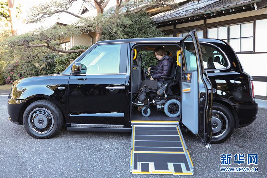 1月10日,在日本東京,一名殘障人士試乘倫敦電動(dòng)汽車(chē)公司的電動(dòng)出租車(chē)TX。 新華社記者 杜瀟逸 攝