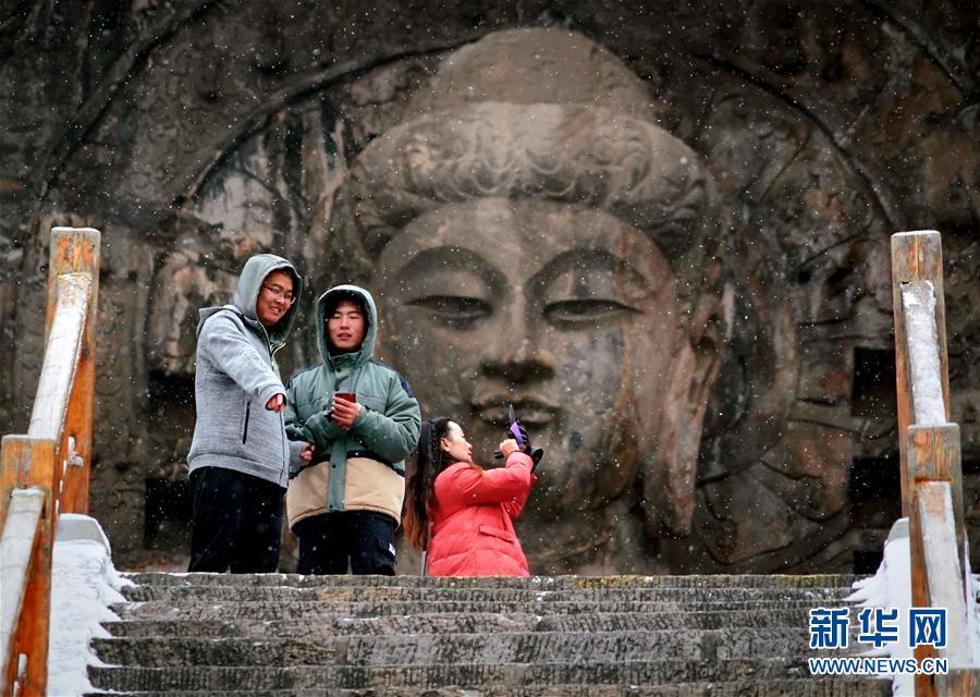 1月9日,游客在洛陽龍門石窟景區(qū)內的盧舍那大佛前拍照賞景。新華社記者李安攝