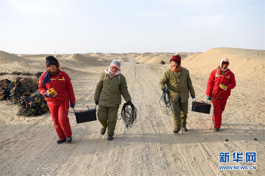 1月14日,4名測線女工抬著電瓶返回營地。地球物理勘探是油氣開發(fā)的第一步,相當于給地球做CT。物探工人按照嚴格的測線部署,在相應位置鉆井,然后實施地震,采集地震波數(shù)據(jù)。科研人員通過數(shù)據(jù)組成的“CT片”,就能夠清晰地“看”到地下的地質(zhì)結(jié)構(gòu),判斷哪里埋藏有石油或者天然氣。2019年10月,東方地球物理勘探有限責任公司塔里木物探處2113隊進入新疆塔克拉瑪干沙漠腹地,開始中古14-21、塔中2兩個區(qū)塊的三維地震勘探。近2000名物探工人將在1000平方公里的范圍內(nèi)一直工作到2020年4月,這也意味著他們將在塔克拉瑪干沙漠腹地連續(xù)度過第14個除夕夜。蘊藏著豐富石油天然氣資源的新疆塔克拉瑪干沙漠有“死亡之?!敝Q,氣候干燥,年降水量在50毫米以下,冬季地表最低溫度超過零下30攝氏度,是世界油氣勘探難度最大的地區(qū)之一。為避開風季,物探工人每年9、10月份進入沙漠,一直工作到來年4月,夜以繼日與黃沙、嚴寒為伴,用辛勤的汗水,為祖國找油找氣。新華社記者丁磊攝