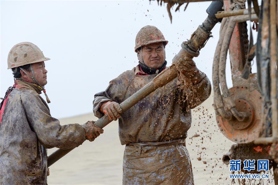 1月13日,鉆井工在連接鉆桿。地球物理勘探是油氣開發(fā)的第一步,相當于給地球做CT。物探工人按照嚴格的測線部署,在相應位置鉆井,然后實施地震,采集地震波數(shù)據(jù)??蒲腥藛T通過數(shù)據(jù)組成的“CT片”,就能夠清晰地“看”到地下的地質(zhì)結(jié)構(gòu),判斷哪里埋藏有石油或者天然氣。2019年10月,東方地球物理勘探有限責任公司塔里木物探處2113隊進入新疆塔克拉瑪干沙漠腹地,開始中古14-21、塔中2兩個區(qū)塊的三維地震勘探。近2000名物探工人將在1000平方公里的范圍內(nèi)一直工作到2020年4月,這也意味著他們將在塔克拉瑪干沙漠腹地連續(xù)度過第14個除夕夜。蘊藏著豐富石油天然氣資源的新疆塔克拉瑪干沙漠有“死亡之?!敝Q,氣候干燥,年降水量在50毫米以下,冬季地表最低溫度超過零下30攝氏度,是世界油氣勘探難度最大的地區(qū)之一。為避開風季,物探工人每年9、10月份進入沙漠,一直工作到來年4月,夜以繼日與黃沙、嚴寒為伴,用辛勤的汗水,為祖國找油找氣。新華社記者丁磊攝