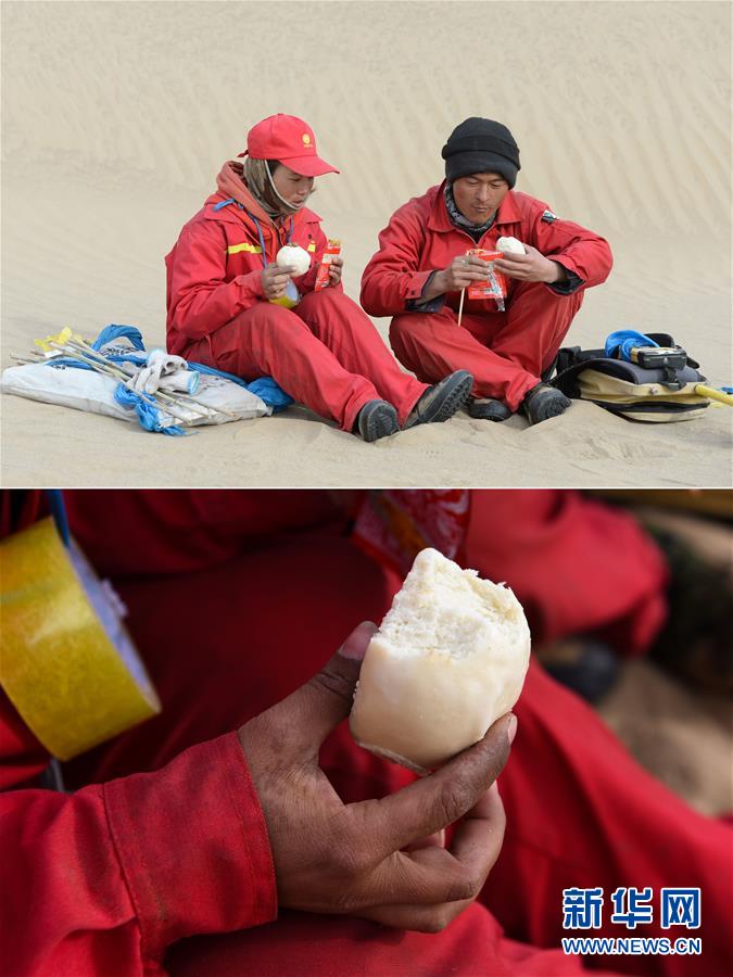 這是一張拼版圖片:上圖為測量工周國燕(左)和丈夫杞朝金在沙漠中解決午餐(1月13日攝);下圖為測量工周國燕在吃冰涼的饅頭(1月13日攝)。地球物理勘探是油氣開發(fā)的第一步,相當于給地球做CT。物探工人按照嚴格的測線部署,在相應位置鉆井,然后實施地震,采集地震波數(shù)據(jù)。科研人員通過數(shù)據(jù)組成的“CT片”,就能夠清晰地“看”到地下的地質(zhì)結(jié)構(gòu),判斷哪里埋藏有石油或者天然氣。2019年10月,東方地球物理勘探有限責任公司塔里木物探處2113隊進入新疆塔克拉瑪干沙漠腹地,開始中古14-21、塔中2兩個區(qū)塊的三維地震勘探。近2000名物探工人將在1000平方公里的范圍內(nèi)一直工作到2020年4月,這也意味著他們將在塔克拉瑪干沙漠腹地連續(xù)度過第14個除夕夜。蘊藏著豐富石油天然氣資源的新疆塔克拉瑪干沙漠有“死亡之?!敝Q,氣候干燥,年降水量在50毫米以下,冬季地表最低溫度超過零下30攝氏度,是世界油氣勘探難度最大的地區(qū)之一。為避開風季,物探工人每年9、10月份進入沙漠,一直工作到來年4月,夜以繼日與黃沙、嚴寒為伴,用辛勤的汗水,為祖國找油找氣。新華社記者丁磊攝