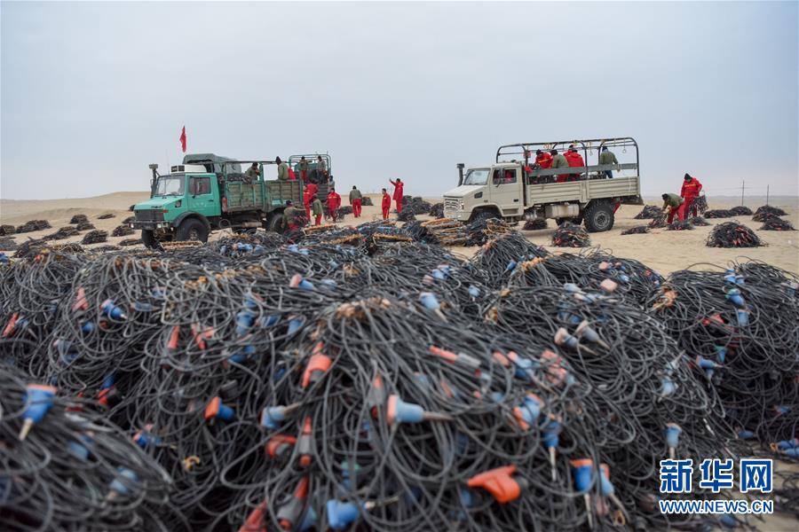 1月14日,放線工在出工前將一捆捆檢波器裝車。地球物理勘探是油氣開發(fā)的第一步,相當(dāng)于給地球做CT。物探工人按照嚴(yán)格的測線部署,在相應(yīng)位置鉆井,然后實(shí)施地震,采集地震波數(shù)據(jù)。科研人員通過數(shù)據(jù)組成的“CT片”,就能夠清晰地“看”到地下的地質(zhì)結(jié)構(gòu),判斷哪里埋藏有石油或者天然氣。2019年10月,東方地球物理勘探有限責(zé)任公司塔里木物探處2113隊(duì)進(jìn)入新疆塔克拉瑪干沙漠腹地,開始中古14-21、塔中2兩個(gè)區(qū)塊的三維地震勘探。近2000名物探工人將在1000平方公里的范圍內(nèi)一直工作到2020年4月,這也意味著他們將在塔克拉瑪干沙漠腹地連續(xù)度過第14個(gè)除夕夜。蘊(yùn)藏著豐富石油天然氣資源的新疆塔克拉瑪干沙漠有“死亡之?!敝Q,氣候干燥,年降水量在50毫米以下,冬季地表最低溫度超過零下30攝氏度,是世界油氣勘探難度最大的地區(qū)之一。為避開風(fēng)季,物探工人每年9、10月份進(jìn)入沙漠,一直工作到來年4月,夜以繼日與黃沙、嚴(yán)寒為伴,用辛勤的汗水,為祖國找油找氣。新華社記者丁磊攝