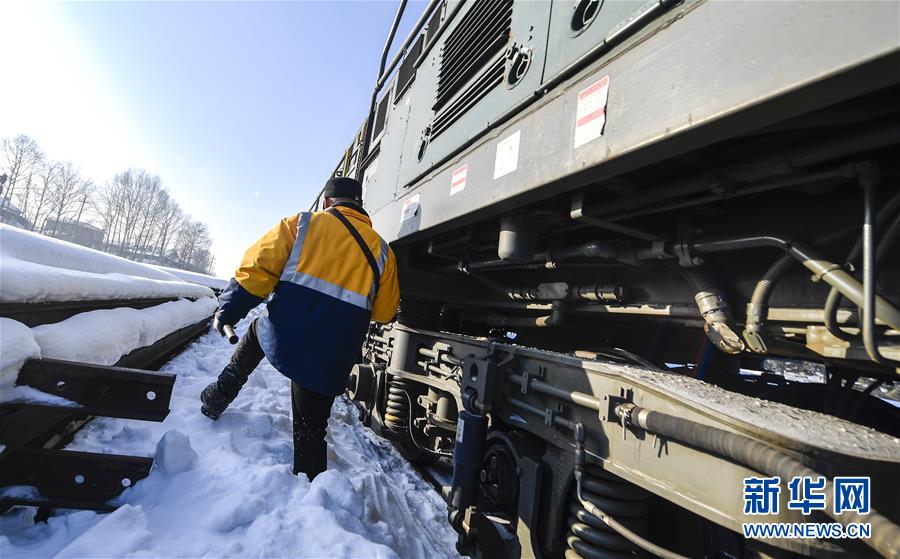 送水員黃衛(wèi)東在雪地中前行,準(zhǔn)備登上火車(chē)前往送水地點(diǎn)(1月17日攝)。新華社記者許暢攝