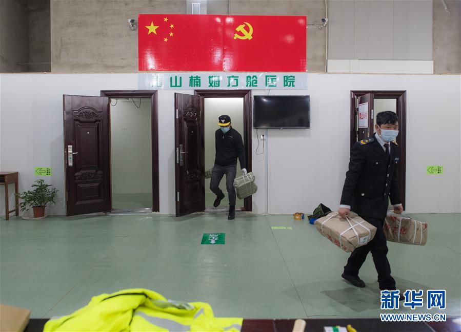 2月25日,在青山楠姆方艙醫(yī)院,工作人員在現(xiàn)場(chǎng)忙碌。 新華社記者 肖藝九 攝