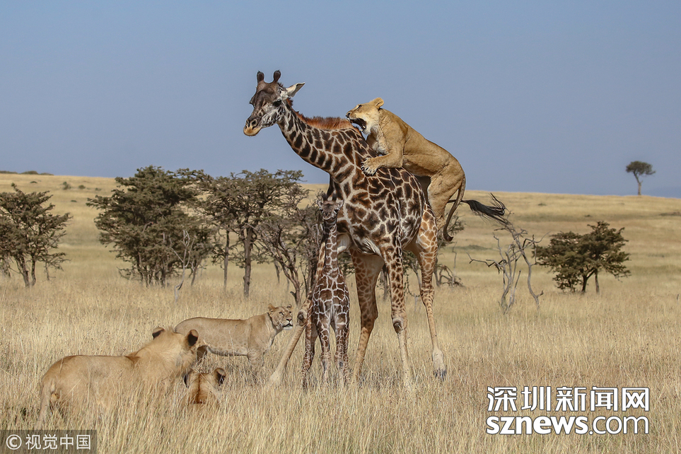當(dāng)?shù)貢r(shí)間2018年8月15日,肯尼亞馬賽馬拉,當(dāng)?shù)貙?dǎo)游詹姆斯·納帕索(James Nampaso)拍攝到一群獅子圍攻母長頸鹿和她的幼崽。盡管長頸鹿勇敢地抵抗獅群的進(jìn)攻,但當(dāng)一頭母獅跳上它的脊背時(shí),它被分散了注意力,使得獅群最終捕獲了它的孩子。