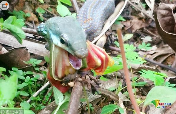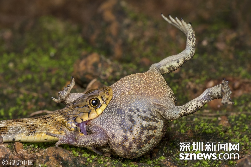 印度加爾各答B(yǎng)olpar,業(yè)余攝影師Agniswar Ghosal在Bolpar散步時(shí)拍到蛇大口吞咽蟾蜍的震撼場景。一條細(xì)長的蛇正試圖整個(gè)吞下一只大蟾蜍,蟾蜍的頭已經(jīng)進(jìn)了蛇口,大半截身體還在外邊。這條野心勃勃的蛇把這只毫無戒心的蟾蜍從洞里拖了出來,然后溜進(jìn)灌木叢,安靜地享用晚餐。
